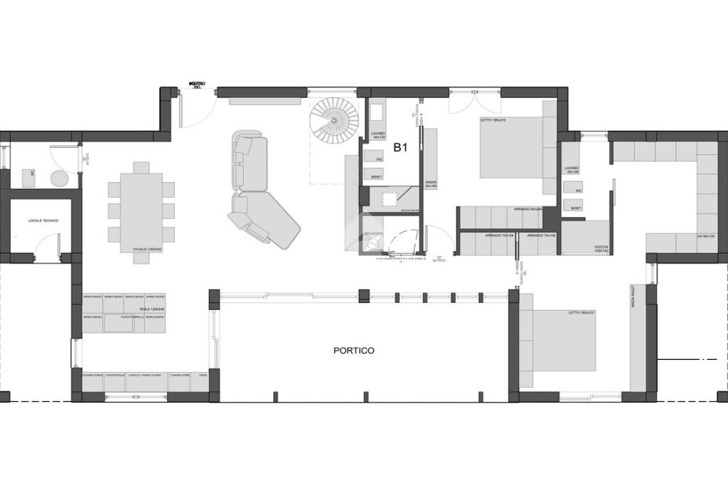 L’ingresso si apre su una grande zona giorno dove soggiorno e cucina a vista, impreziosita da un’ampia isola centrale, creano un ambiente conviviale e raffinato. Le vetrate scorrevoli permettono di vivere gli spazi interni ed esterni come un unico ambiente, affacciandosi su un portico molto ampio, ideale per pranzi, cene all’aperto e momenti di relax. A completare la funzionalità del piano troviamo un bagno di servizio e un comodo ripostiglio.